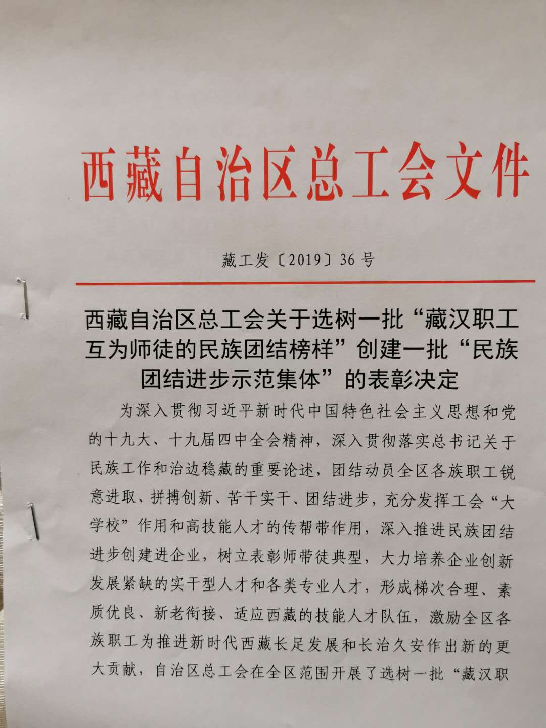 西藏自治區(qū)總工會關于選樹一批 "藏漢職工互為師徒的民族團結榜樣 "創(chuàng)建一批 "民族團結進步示范集體 "的表彰決定