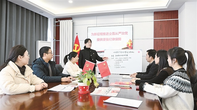 河南省洛陽(yáng)市偃師區(qū)紀(jì)委監(jiān)委將學(xué)習(xí)新修訂的紀(jì)律處分條例作為今年紀(jì)律教育的“第一課”,推動(dòng)紀(jì)檢監(jiān)察干部深刻認(rèn)識(shí)修訂紀(jì)律處分條例的重要意義和豐富內(nèi)涵,將學(xué)習(xí)成果內(nèi)化于心、外化于行。圖為該區(qū)紀(jì)委監(jiān)委機(jī)關(guān)第五黨支部組織學(xué)習(xí)新修訂的紀(jì)律處分條例。 牛光衛(wèi) 攝