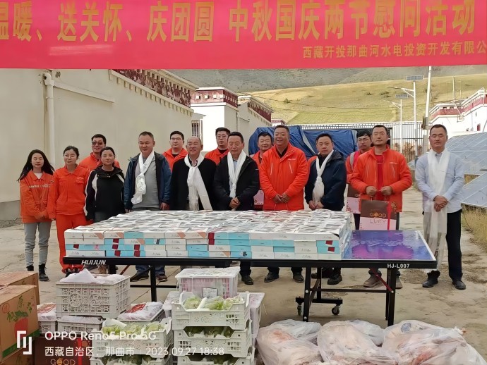 9月27日,西藏開投那曲河水電開發(fā)投資有限公司組織開展送溫暖、送關(guān)懷、慶團(tuán)圓中秋國慶兩節(jié)慰問活動,集團(tuán)公司副總經(jīng)理尼瑪出席活動,那曲河公司總經(jīng)理何驍及其它相關(guān)人員參加。