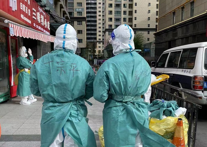 疫情當(dāng)下,要戰(zhàn)斗就要去最危險(xiǎn)的地方。丁宗平把家安在了防疫現(xiàn)場(chǎng),忙碌的身影穿梭在自己負(fù)責(zé)的高風(fēng)險(xiǎn)小區(qū)的每個(gè)角落,凡事親力親為,從樓道消殺到運(yùn)送防疫物資,從取樣前期準(zhǔn)備工作到零距離核酸采樣,從為有需求的居民代買生活必需品到一一分發(fā)至每家每戶。重復(fù)的話語需要說上千次萬次,工作一天下來,嗓子又干又啞,忙時(shí)僅靠泡面充饑,但看見疫情防控工作能夠順利開展,他覺得一切都是值得的。