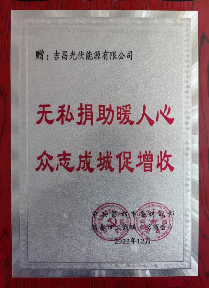 4月26日,中共昌都市委統(tǒng)戰(zhàn)部、昌都市工商聯(lián)(總商會)聯(lián)合授予西藏開投吉昌光伏能源有限公司“無私捐助暖人心 眾志成城促增收”榮譽獎牌,對公司充分發(fā)揮典型示范帶動效應(yīng),有效增強“萬企興萬村”促增收、“百企幫百戶”等活動影響力和凝聚力,為昌都市鄉(xiāng)村振興貢獻企業(yè)力量予以肯定和鼓勵?!?/div>