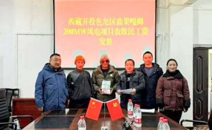 11月28日、12月2日,西藏開投那曲河水電公司組織舉行色尼區(qū)曲果嘎姆200MW風(fēng)電項目農(nóng)牧民工資發(fā)放儀式,為羅瑪鎮(zhèn)、香茂鄉(xiāng)5個村共計338人發(fā)放工資129.96萬元。
