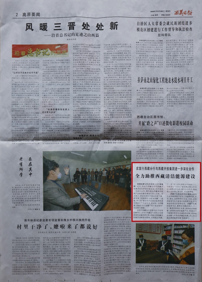 (編者按)《西藏日?qǐng)?bào)》2022年5月26日在第2版“高原要聞”欄目刊登文章,報(bào)道集團(tuán)公司與農(nóng)發(fā)行西藏分行銀企攜手全力助推西藏清潔能源建設(shè)。全文如下: