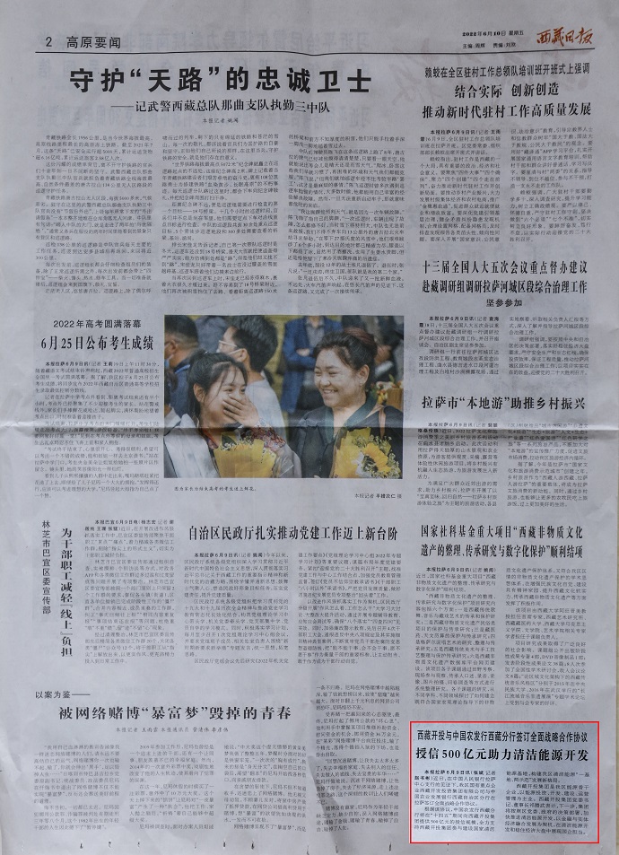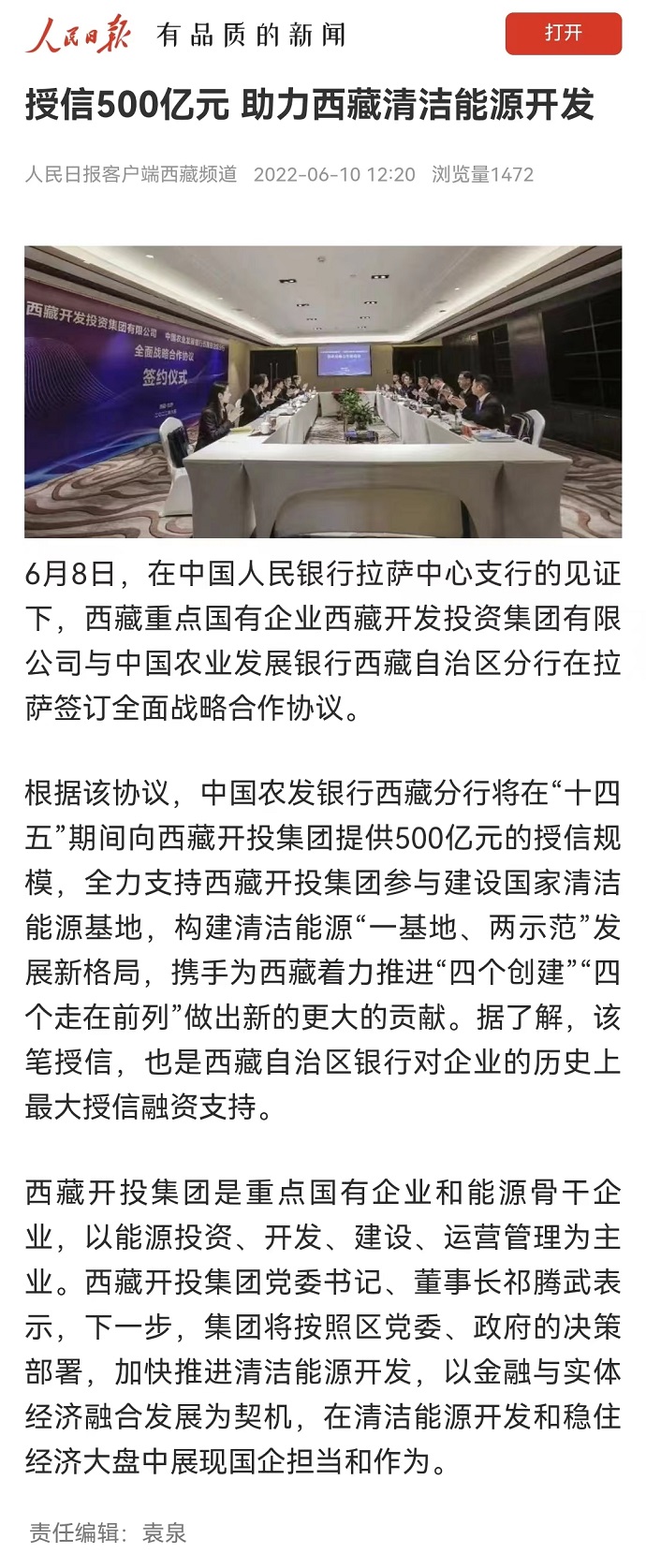 ?。ň幷甙矗?月10日,《人民日報》客戶端西藏頻道報道了《授信500億元  助力西藏清潔能源開發(fā)》?!段鞑厝請蟆?022年6月10日在第2版“高原要聞”欄目刊登文章,報道《授信500億元|西藏開投集團與中國農(nóng)發(fā)行西藏分行簽訂全面戰(zhàn)略合作協(xié)議》。西藏電視臺2022年6月10日在西藏電視臺影視文化頻道《今晚九點》欄目報道了《授信500億元|西藏開投集團與中國農(nóng)發(fā)行西藏分行簽訂全面戰(zhàn)略合作協(xié)議》,《珠峰云》平臺同步播放。新華網(wǎng)、經(jīng)濟日報、西藏衛(wèi)視、西藏日報客戶端、網(wǎng)信西藏、今日頭條等媒體均報道了相關(guān)新聞。全文如下: