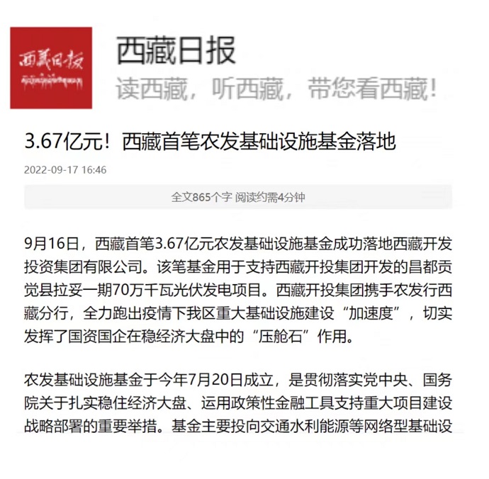 (編者按)《西藏日報》2022年9月17日報道西藏首筆農(nóng)發(fā)基礎(chǔ)設(shè)施基金落地西藏開投集團。全文如下:
