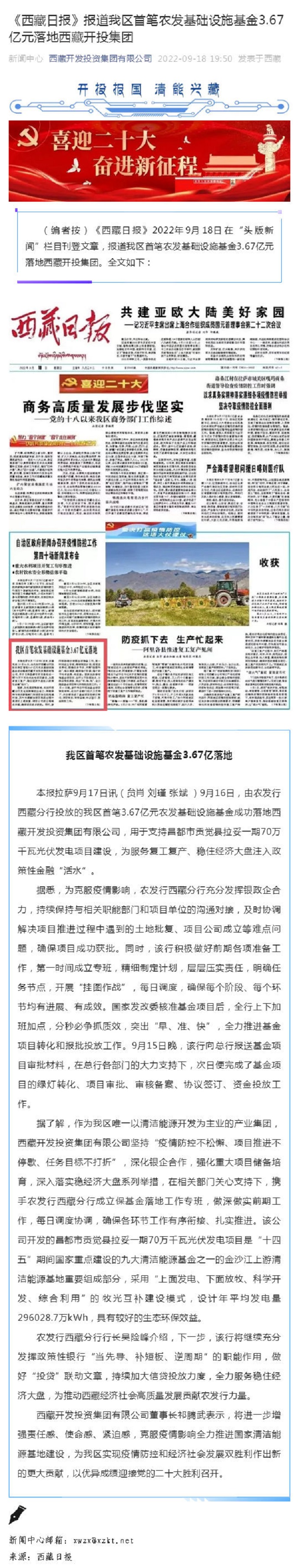 《西藏日報》報道我區(qū)首筆農(nóng)發(fā)基礎(chǔ)設(shè)施基金3.67億元落地西藏開投集團(tuán)
