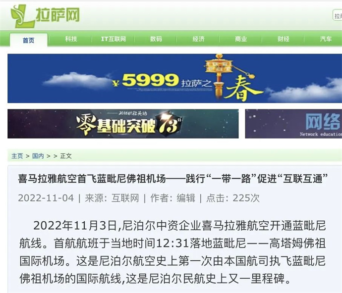 中華網(wǎng)、中國網(wǎng)、中企網(wǎng)、中國日報、光明日報、中國旅游新聞網(wǎng)、中國西藏新聞網(wǎng)、拉薩新聞網(wǎng)等媒體報道喜航開通加德滿都至藍毗尼航線