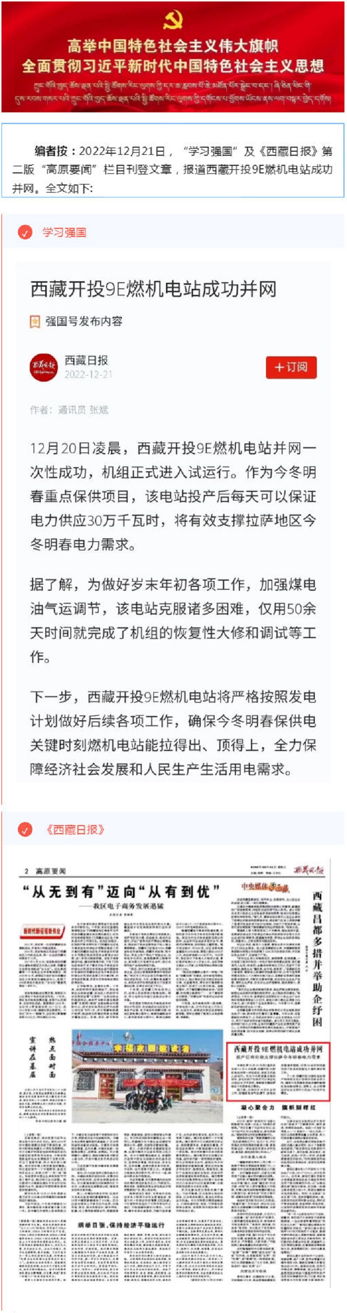 “學(xué)習(xí)強(qiáng)國(guó)”、《西藏日?qǐng)?bào)》報(bào)道西藏開(kāi)投9E燃機(jī)電站成功并網(wǎng)