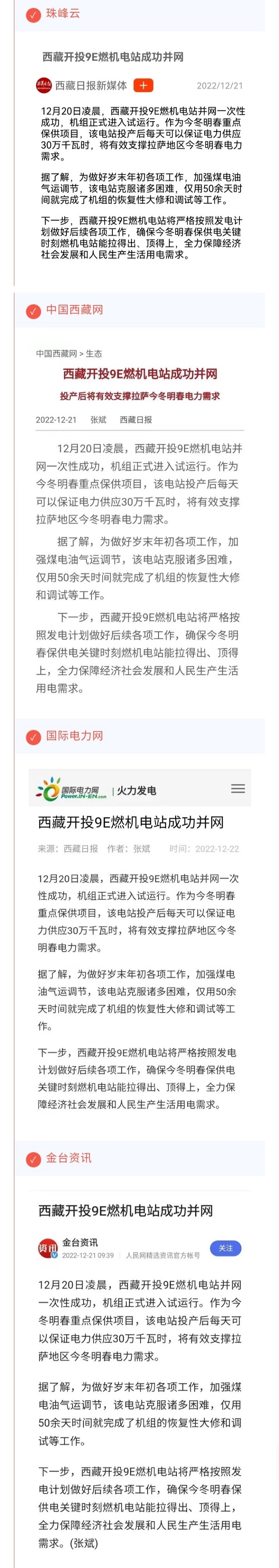西藏衛(wèi)視(西藏新聞聯(lián)播)、珠峰云、中國西藏網(wǎng)、國際電力網(wǎng)及金臺資訊等媒體報(bào)道西藏開投9E燃機(jī)電站成功并網(wǎng)