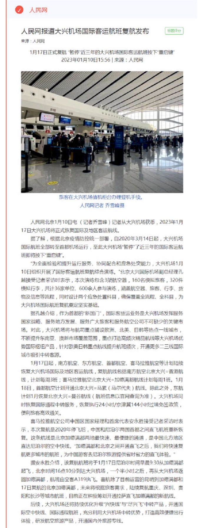 人民網(wǎng)報(bào)道大興機(jī)場國際客運(yùn)航班復(fù)航發(fā)布會(huì)