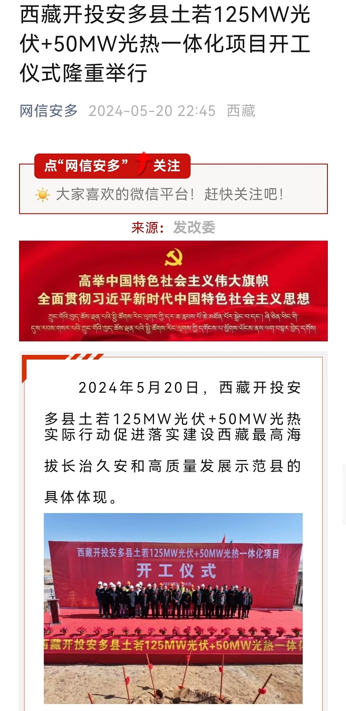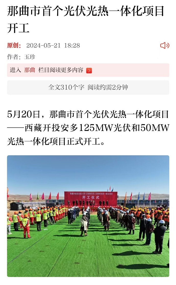 編者按:近日,西藏日報、網(wǎng)信安多等媒體報道了《那曲市首個光伏光熱一體化項目開工》文章。摘要如下: