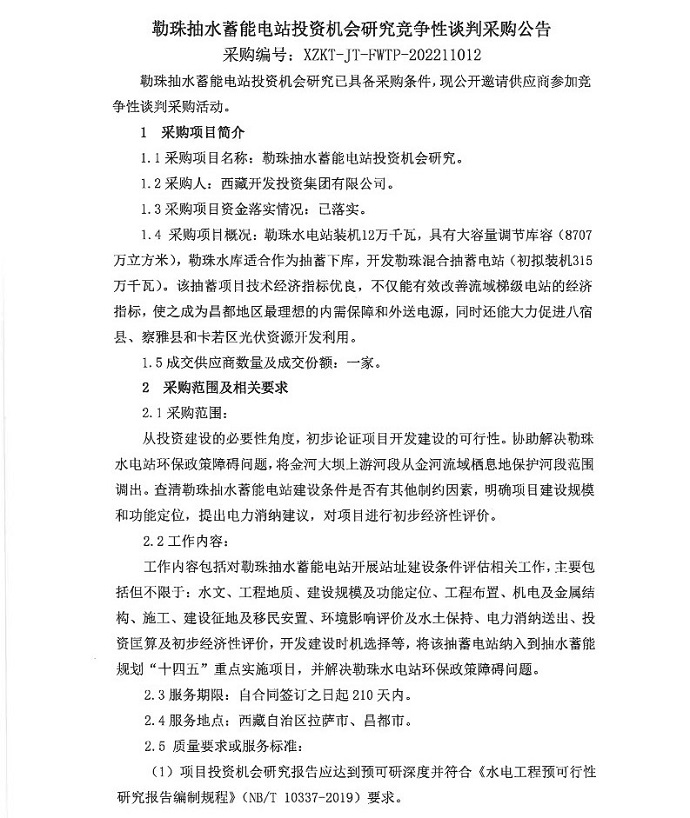 勒珠抽水蓄能電站投資機(jī)會研究競爭性談判采購公告