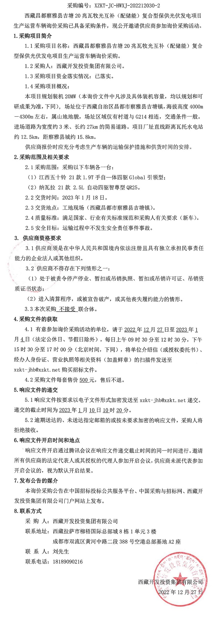 西藏昌都察雅縣吉塘20兆瓦牧光互補(bǔ)(配儲(chǔ)能)復(fù)合型保供光伏發(fā)電項(xiàng)目生產(chǎn)運(yùn)營車輛詢價(jià)采購二次公告