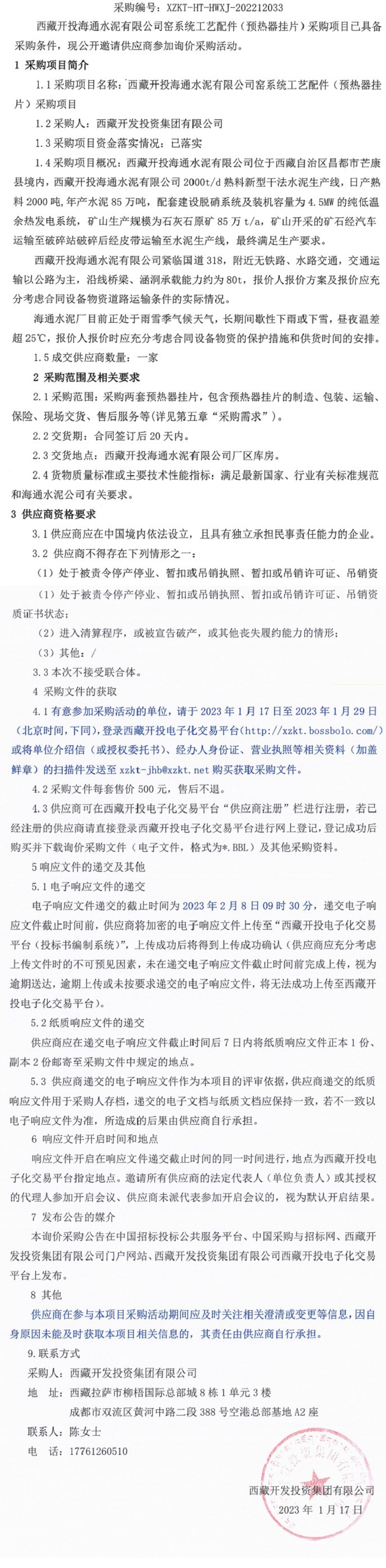 西藏開投海通水泥有限公司窯系統(tǒng)工藝配件(預(yù)熱器掛片)采購(gòu)項(xiàng)目詢價(jià)采購(gòu)公告