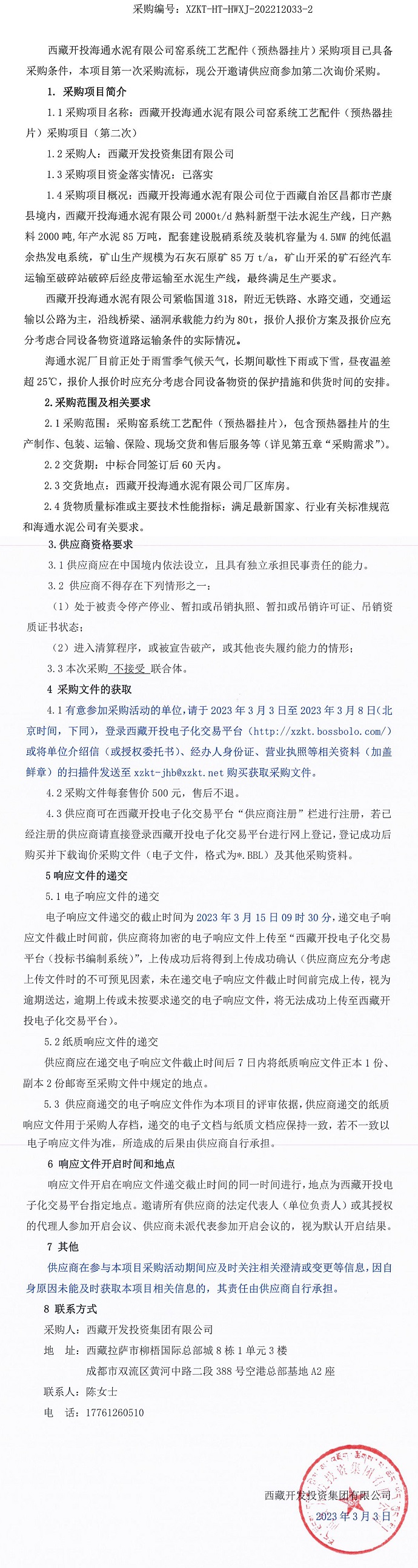 西藏開投海通水泥有限公司窯系統(tǒng)工藝配件(預(yù)熱器掛片)采購項目(第二次)詢價采購公告
