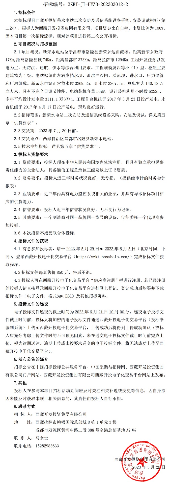藏開投新榮水電站二次安防及通信系統(tǒng)設(shè)備采購、安裝調(diào)試招標(biāo)(第二次)公告
