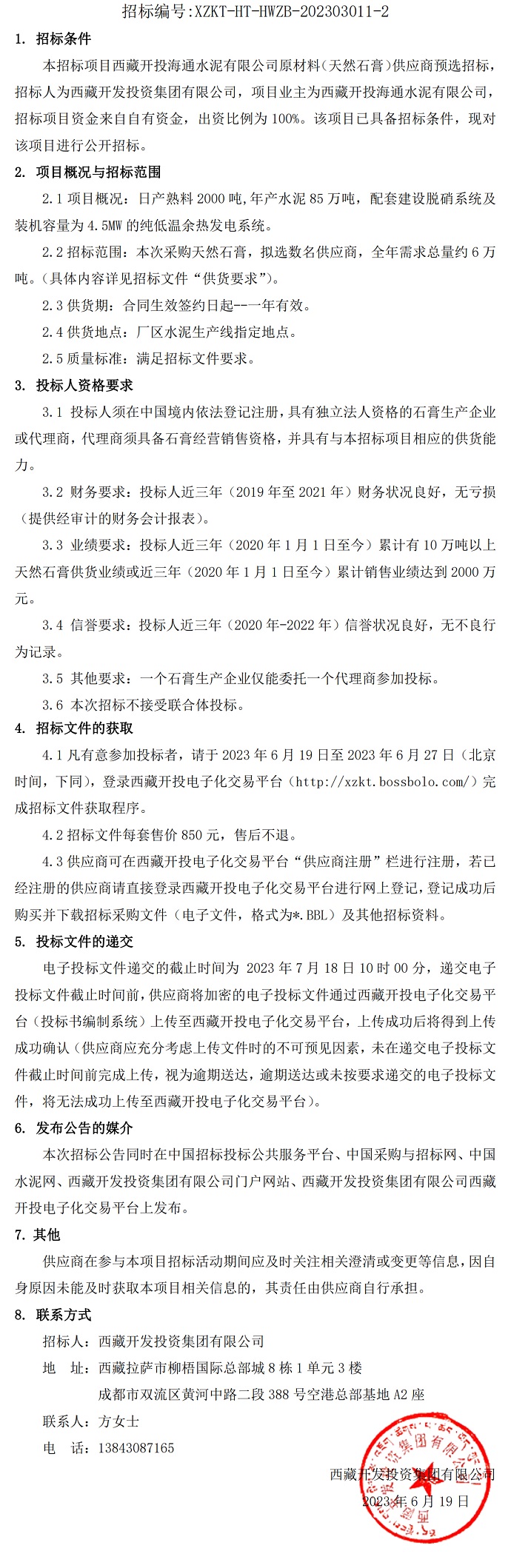 西藏開投海通水泥有限公司原材料(天然石膏)供應(yīng)商預(yù)選招標(biāo)公告(二次)