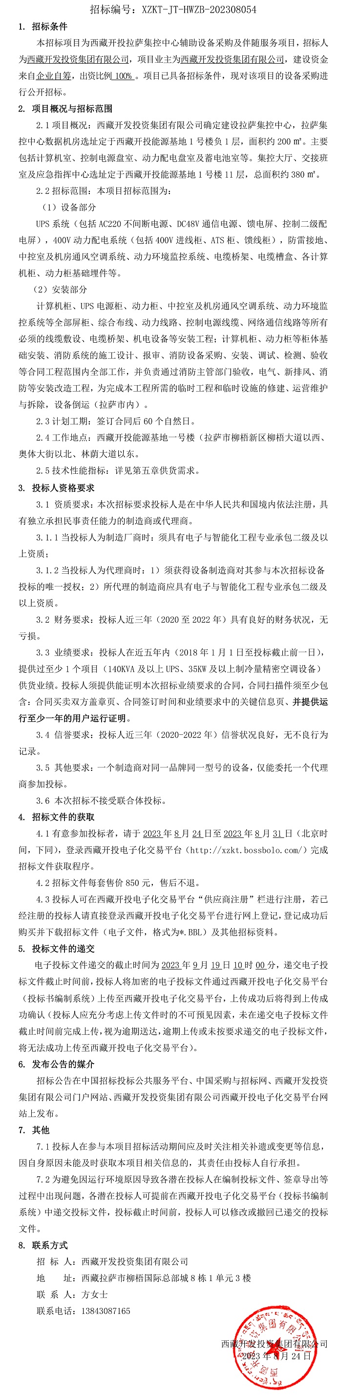 西藏開發(fā)投資集團有限公司拉薩集控中心輔助設備采購及伴隨服務項目招標公告