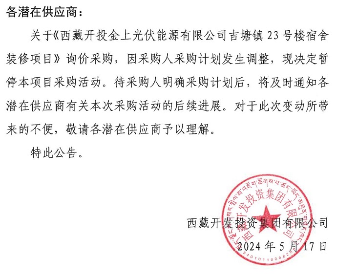 關(guān)于暫停《西藏開投金上光伏能源有限公司吉唐鎮(zhèn)23號(hào)樓宿舍裝修項(xiàng)目》詢價(jià)采購活動(dòng)的公告