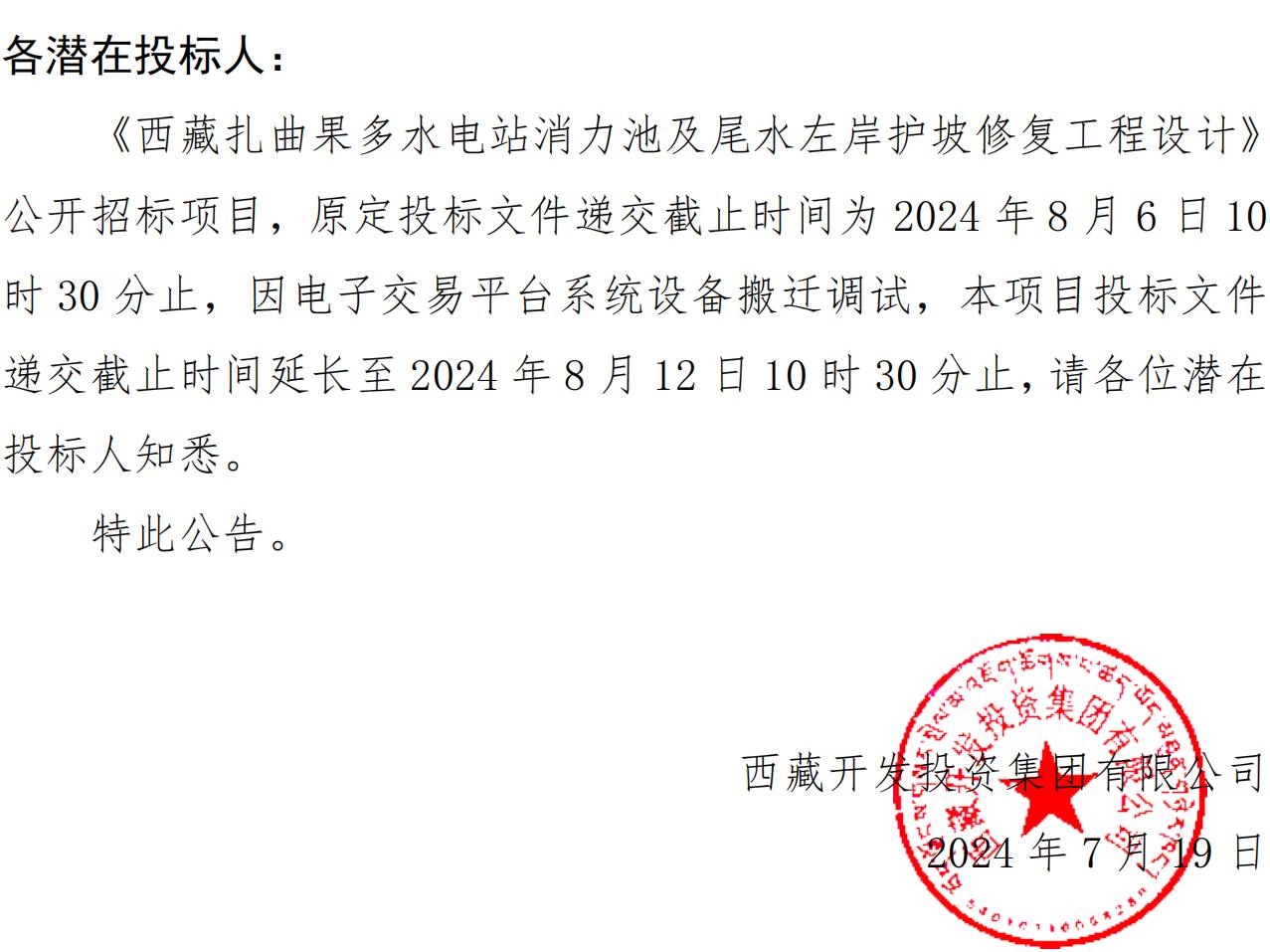 關(guān)于延長《西藏扎曲果多水電站消力池及尾水左岸護坡修復(fù)工程設(shè)計》投標(biāo)文件遞交截止時間的公告