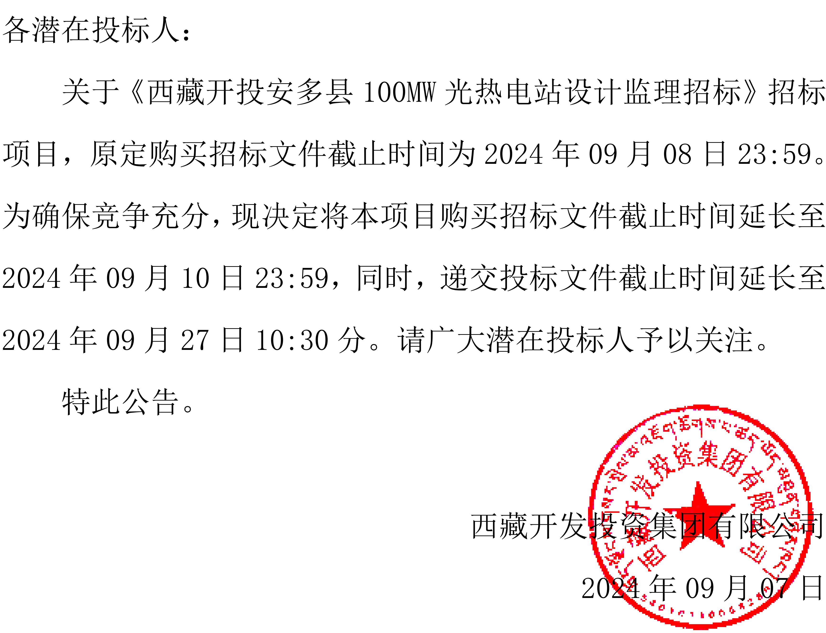 關(guān)于延長《西藏開投安多縣100MW光熱電站設(shè)計(jì)監(jiān)理 招標(biāo)》購買招標(biāo)文件截止時(shí)間的公告