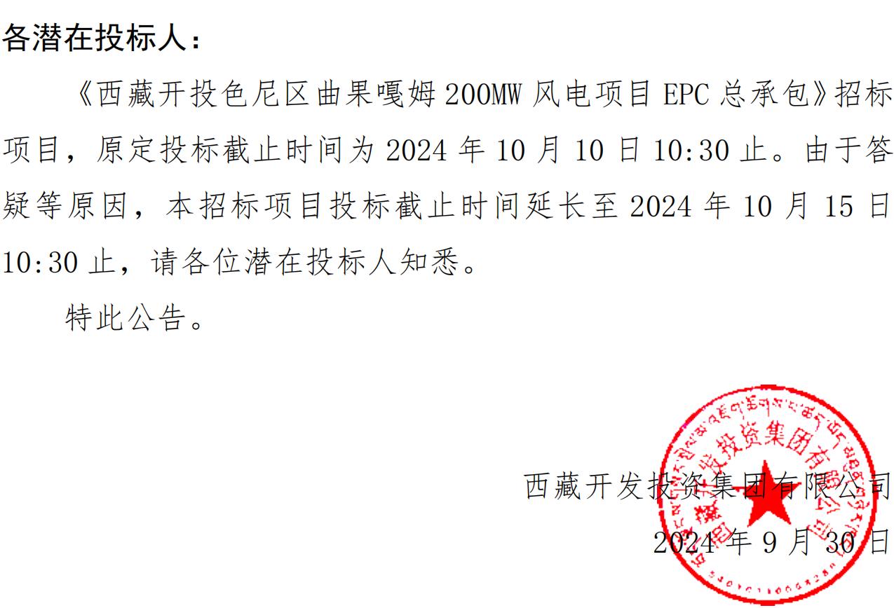 關(guān)于延長(zhǎng)《西藏開(kāi)投色尼區(qū)曲果嘎姆200MW風(fēng)電項(xiàng)目EPC總承包》投標(biāo)截止時(shí)間的公告