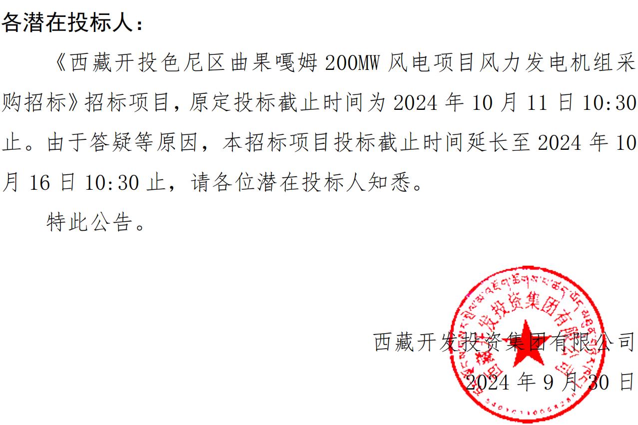 關(guān)于延長《西藏開投色尼區(qū)曲果嘎姆200MW風電項目風力發(fā)電機組采購招標》投標截止時間的公告