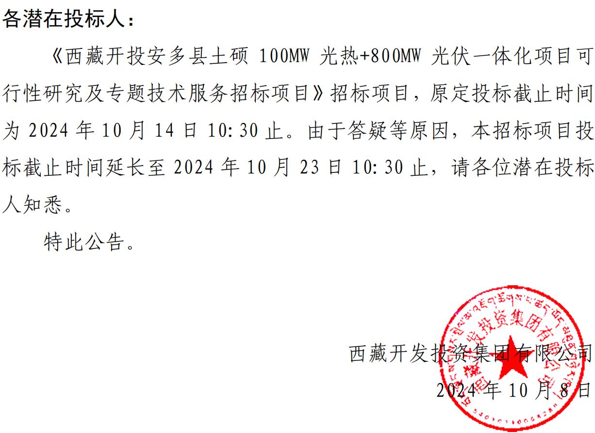 關(guān)于延長《西藏開投安多縣土碩 100MW光熱+800MW 光伏一體化項目可行性研究及專題技術(shù)服務(wù)招標項目》投標截止時間的公告