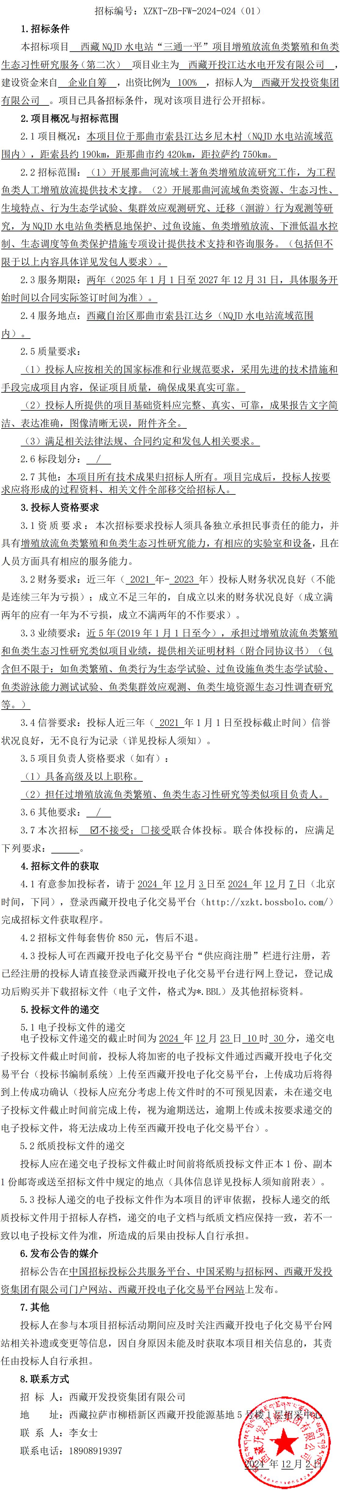 西藏 NQJD 水電站“三通一平”項(xiàng)目增殖放流魚類繁殖和魚類生態(tài)習(xí)性研究服務(wù)(第二次)招標(biāo)公告