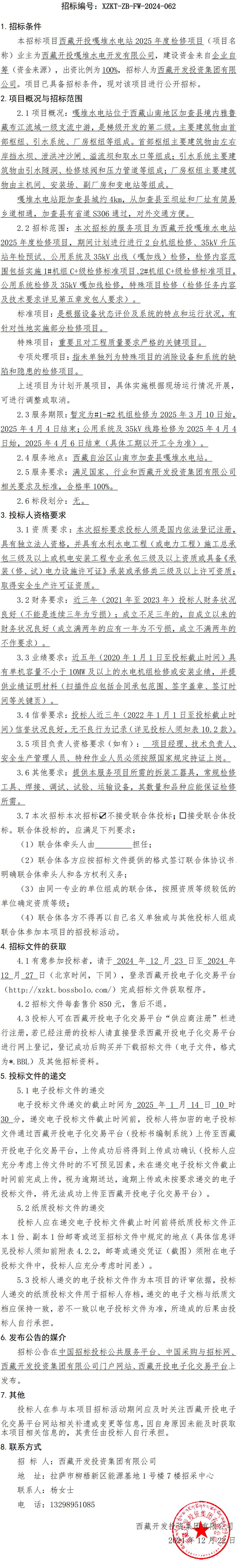 西藏開投嘎堆水電站2025年度檢修項目招標公告
